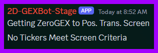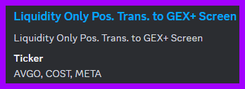 Zero2Ptrans: Returns stocks that closed above ZeroGex but below Ptrans. ZeroGex is generally in the middle of the transition zone and is theoretically where call and put gamma is balanced. In a bullish environment, this level can act as support and resistance in a bearish environment. Trades off ZeroGEX can be thought of as aggressive first entries with an anticipation of a move through PTrans (more on this discussed in the scan below). For confluence, we want to see these stocks also populate on the $calldomdel scan above.