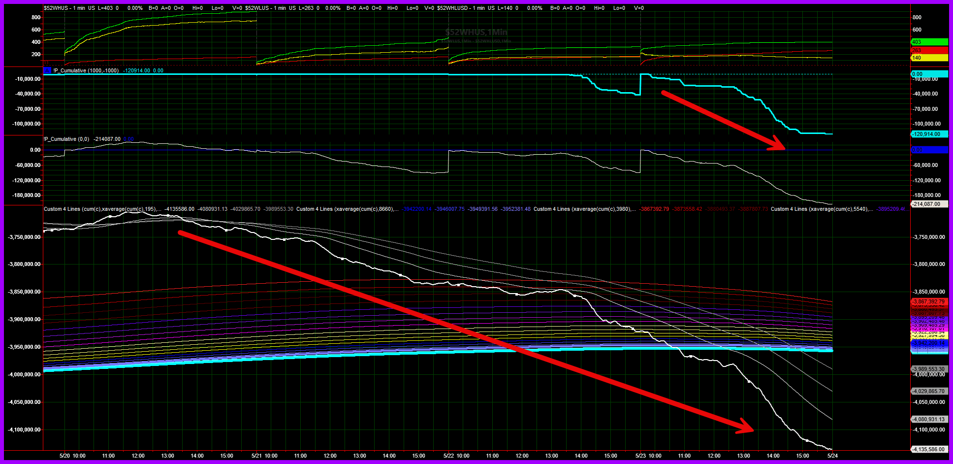 Below is our $volm command, which displays the "centroid" of put and call volume for each 15 minute slice of yesterday's session. Paired with the GIF above, it's powerful to see how both the call and put centroids moved throughout the session. Notice the confluence of the trending move lower in the call and put centroid. This corresponded with the move lower in the Market Trend Model (shown below). These two used in combination, along with the key levels/zone noted from market structure, are powerful tools used for intraday setups.