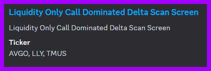 CallDomDel: Returns stocks with are call dominated below and above spot price. This scans helps us to monitor overall market sentiment by seeing the number of stocks that are populated in the scan. Additionally, the scan helps us find favorable candidates to the upside as we know that a bullish signature is when we see call holders below spot price (as opposed to put speculators) as well as call speculators above spot price (as opposed to put holders). This condition of call speculators above and call holders below indicates that the wisdom of crowds is more favorable on the stock than not.