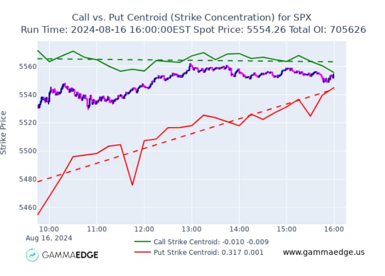 Paired with our Market Trend Model (below) intraday, it's powerful to see how both the call and put centroids moved throughout the session along with the MTM and spot price.