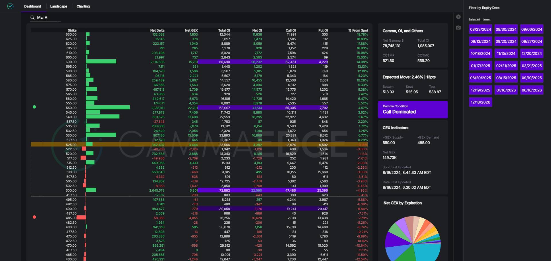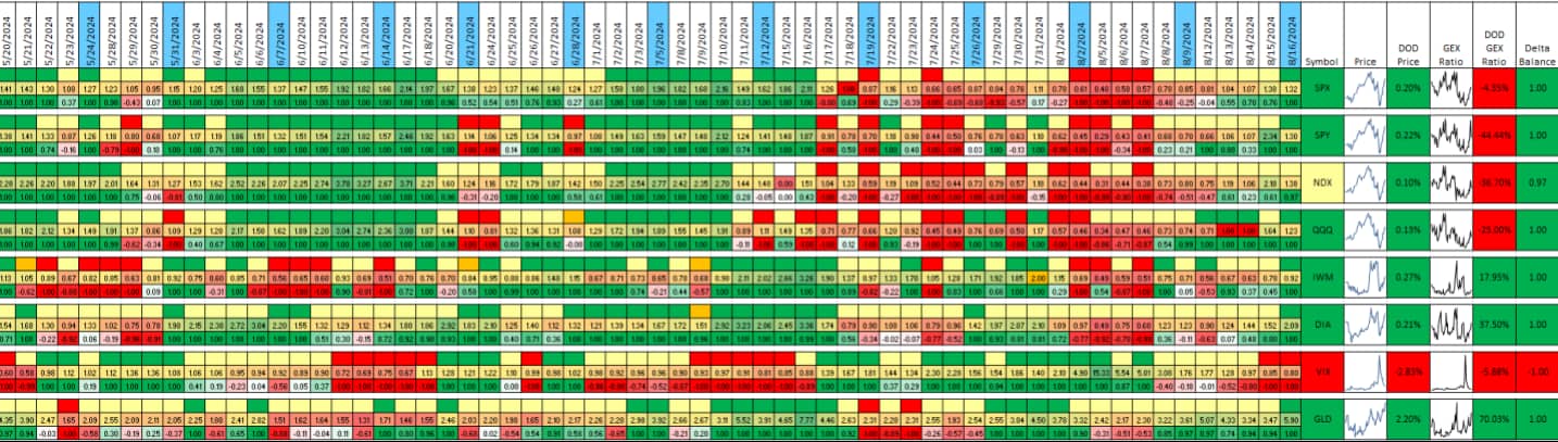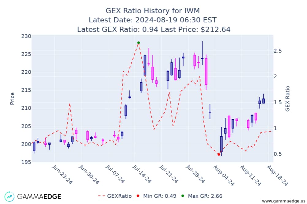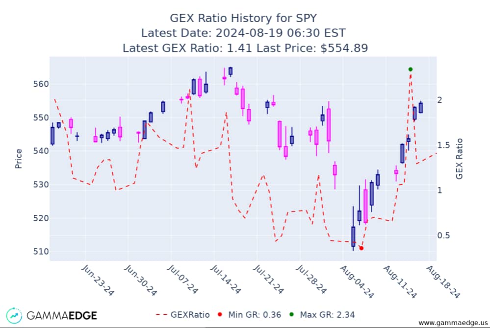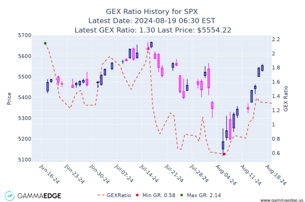 The GEX Ratio is defined as cumulative call gamma divided by cumulative put gamma. This ratio provides a snapshot of market sentiment, with higher values indicating more bullish conditions and lower values suggesting more bearish conditions.