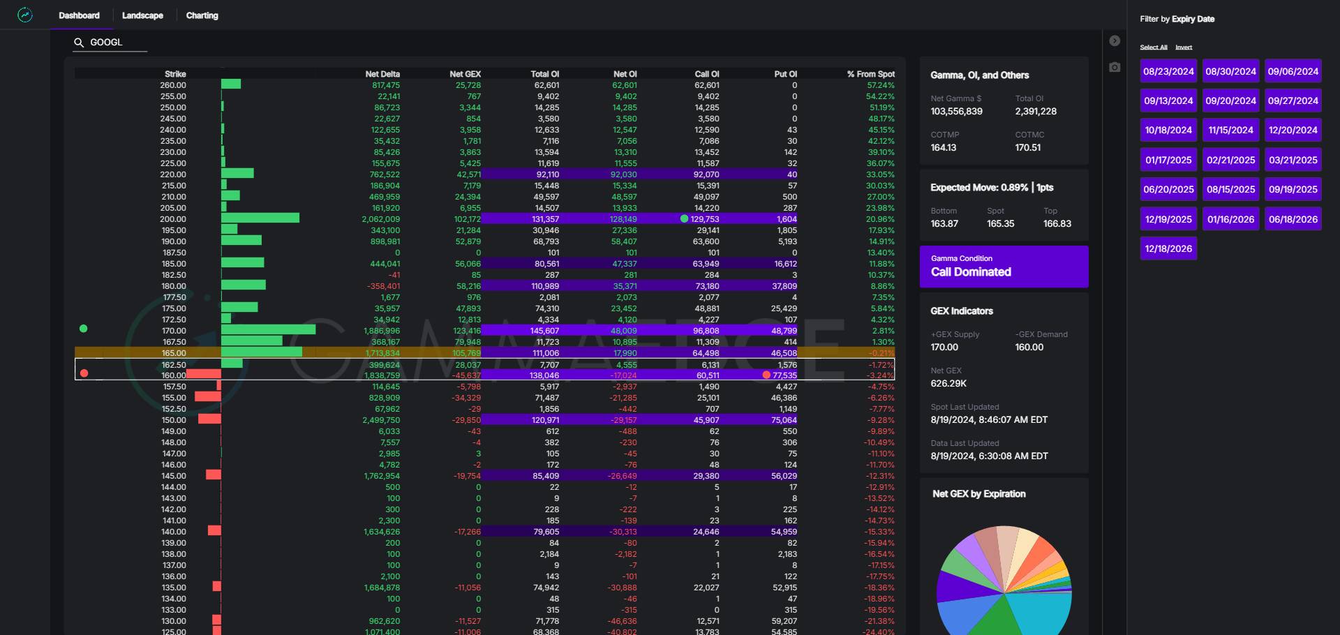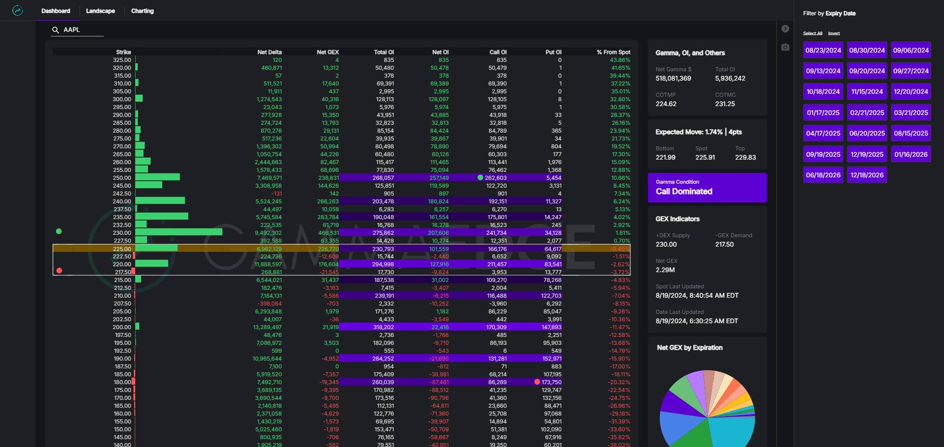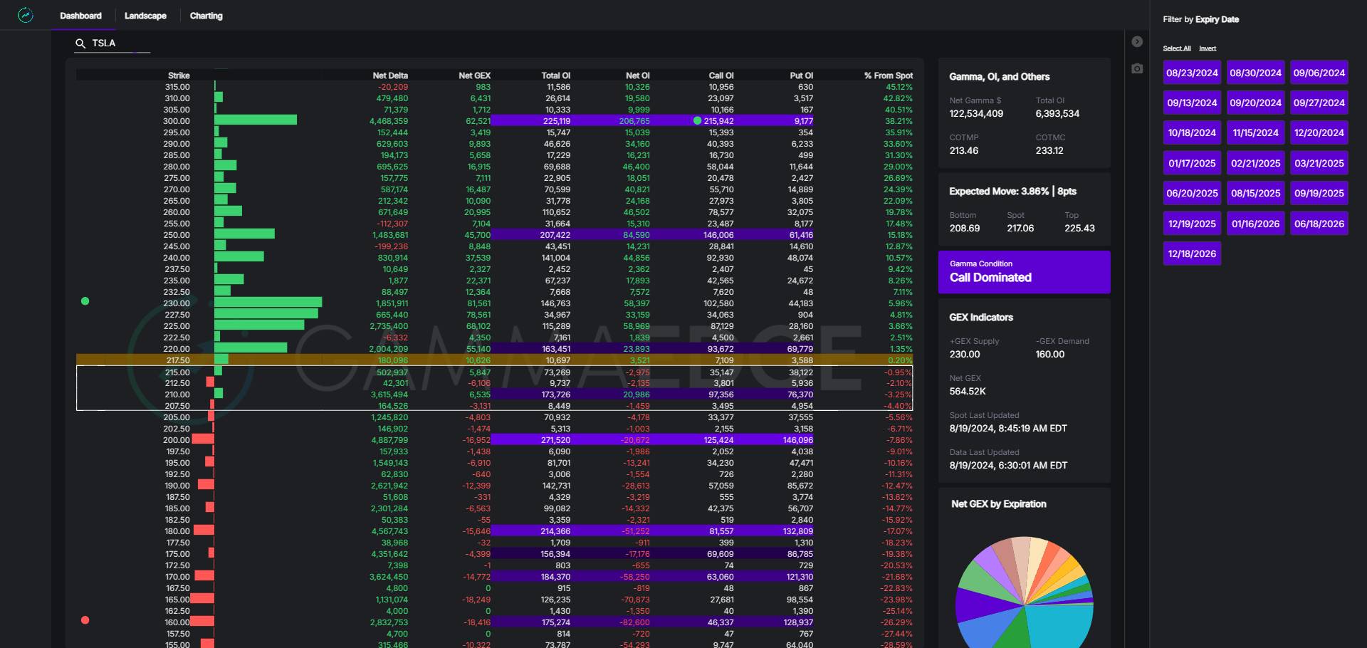 The GEX Ratio is defined as cumulative call gamma divided by cumulative put gamma. This ratio provides a snapshot of market sentiment, with higher values indicating more bullish conditions and lower values suggesting more bearish conditions.