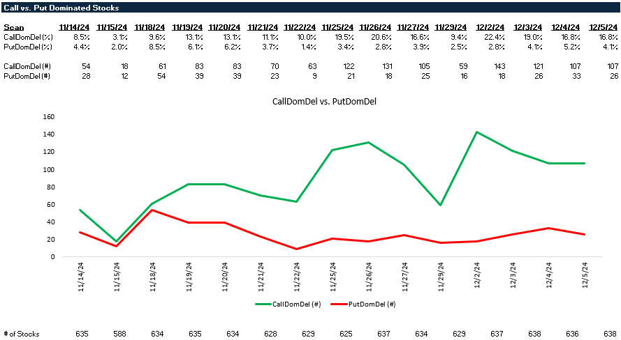 CallDomDel vs. PutDomDel: This chart can be used to better understand market sentiment. Are call dominated or put dominated stocks growing/shrinking day over day?