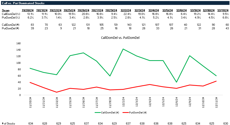 CallDomDel vs. PutDomDel: This chart can be used to better understand market sentiment. Are call dominated or put dominated stocks growing/shrinking day over day?