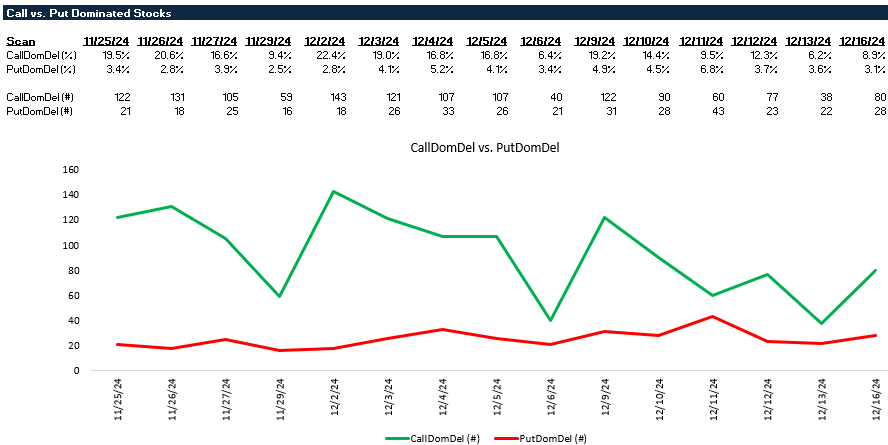 CallDomDel vs. PutDomDel: This chart can be used to better understand market sentiment. Are call dominated or put dominated stocks growing/shrinking day over day?