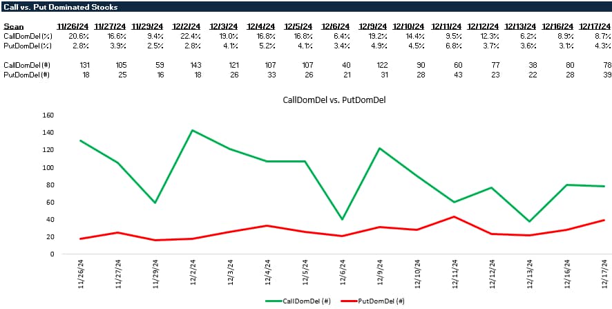 CallDomDel vs. PutDomDel: This chart can be used to better understand market sentiment. Are call dominated or put dominated stocks growing/shrinking day over day?