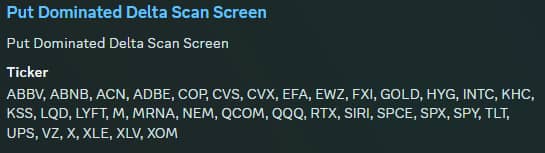 PutDomDel: Returns stocks that are put-dominated above and below spot price, which are a signature of bearish structures. This is an ideal 'pond to fish in' if you are looking for names to short (or names you should avoid going long if bullish).