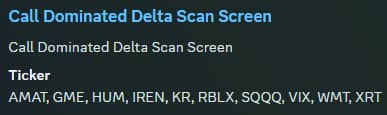 CallDomDel: This scan returns stocks that are call-dominated above and below spot price, which are a signature of bullish structures. This is an ideal 'pond to fish in' if you are looking for names to get long (or names you should avoid shorting if bearish).