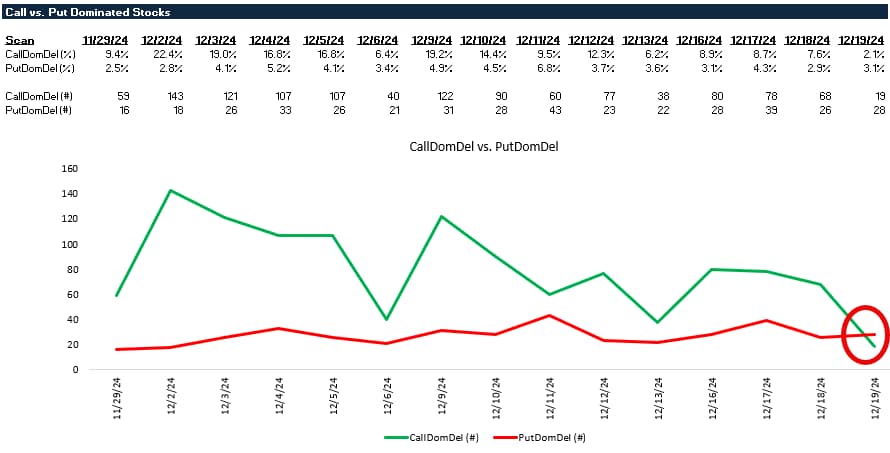 CallDomDel vs. PutDomDel: This chart can be used to better understand market sentiment. Are call dominated or put dominated stocks growing/shrinking day over day?